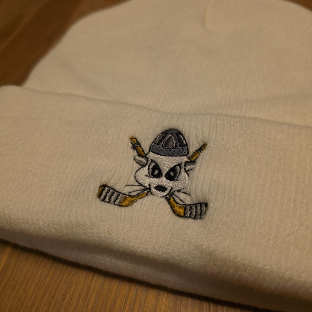 Valkoinen pipo brodeeratulla EtäKärppien logolla